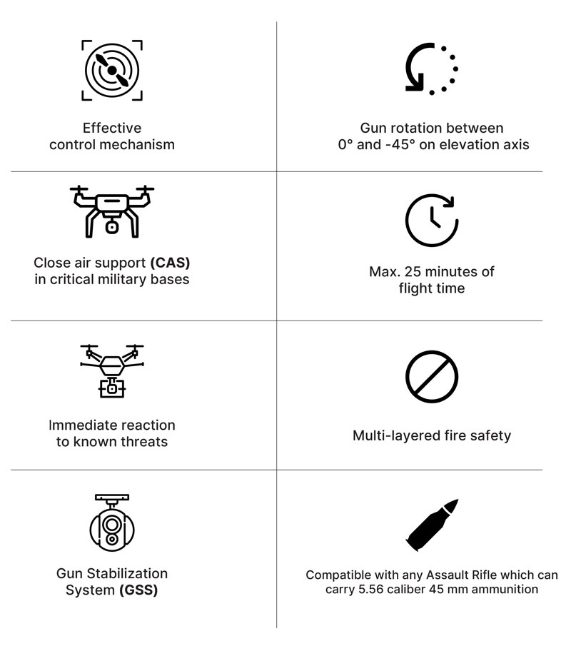 Bay Galata, muharebe ihtiyaçları ve stratejik hedeflerin vurulması için uzun menzilli ve etkili imha kabiliyetine sahip yerli çözümler sunmaya devam etmektedir. Bu kapsamda, Türkiye’nin önde gelen roket üreticilerinden biri tarafından geliştirilen, dronlardan ateşlenebilen, güdümsüz 40 mm’lik mini roket, KARTAL ROKET FIRLATMA DRONE’un yetenekleriyle birleştirilerek BAYGUN DRONE sistemine entegre edilmiştir ve Türk Savunma Sanayii’nin hizmetine sunulmuştur. KARTAL ROKET FIRLATMA DRONE Roket Fırlatma Sistemi, havadan etkili bir şekilde kullanılabilmekte, maliyet açısından avantaj sunmakta ve çoklu atış özelliğiyle sahada caydırıcı bir güç oluşturmaktadır.